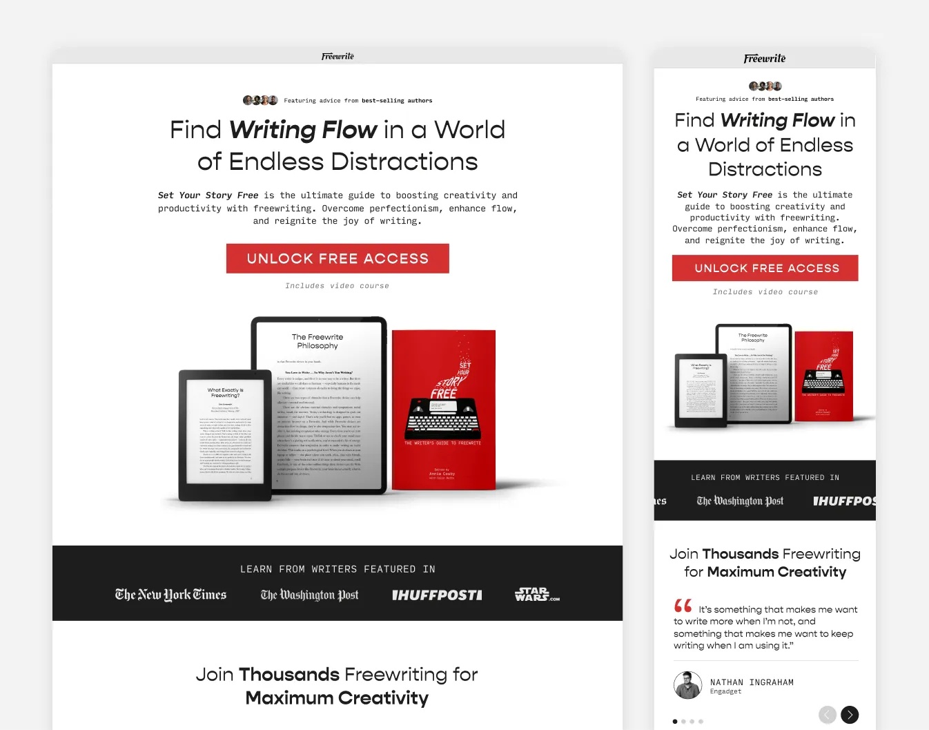 We worked to design and deploy a dedicated Lead Generation Landing Page for their "Set Your Story Free" e-book. The objective was to create a specific entry point for cold traffic that focused less on technical specifications and more on the emotional struggle of the writer (distraction and writer's block), effectively warming up users for a high-ticket purchase.